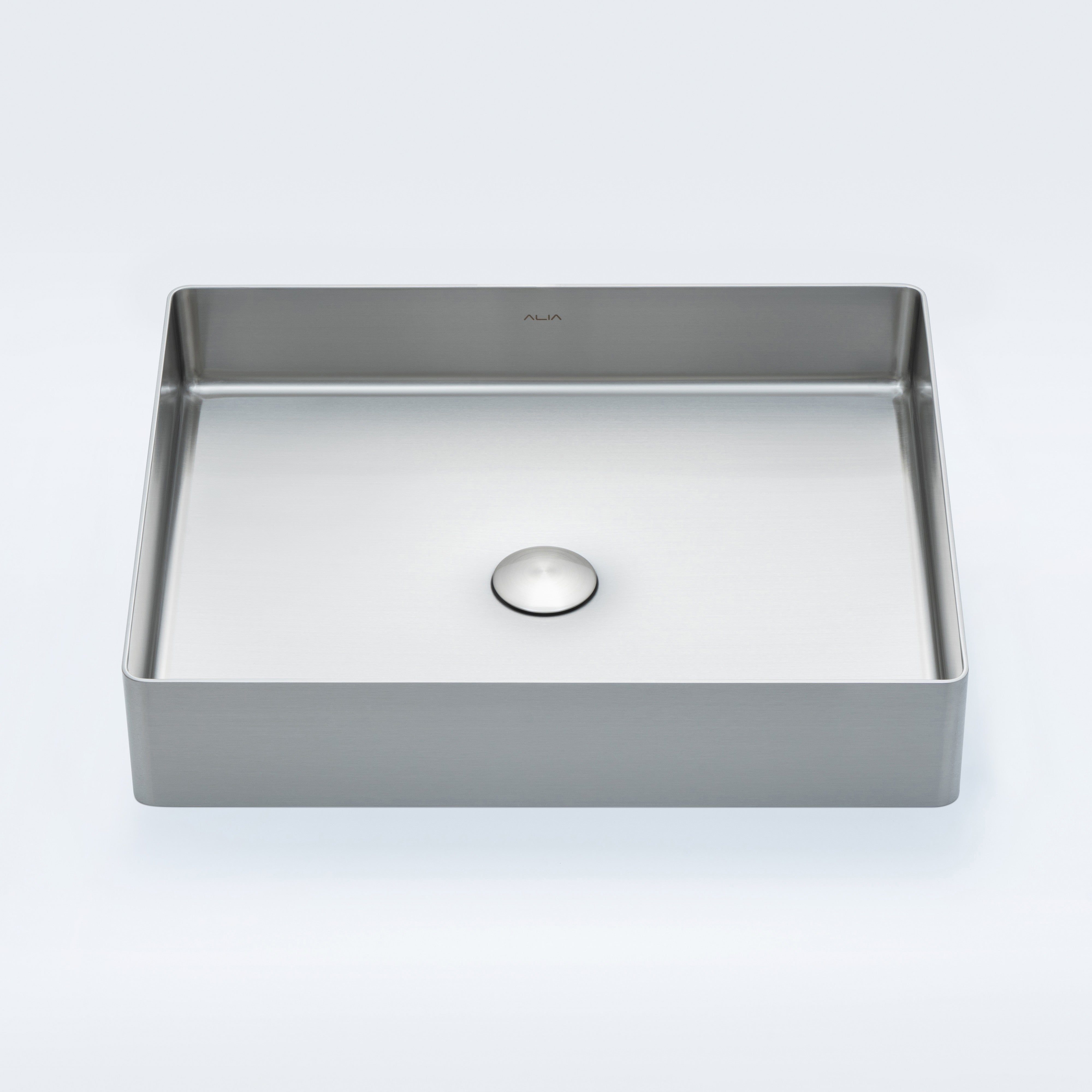 Brushed silver rectangular stainless steel bathroom basin by ALIA, showcasing a modern design perfect for contemporary bathrooms and hygienic spaces.
